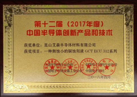 2018年4月12日,由中國半導體行業協會主辦的“2018年中國半導體市場年會暨第七屆集成電路產業創新大會”在南京萬達希爾頓酒店舉行,江蘇艾森半導體材料股份有限公司的“一種側蝕小的銅蝕刻液GCTECU312系列”產品獲得了“第十二屆(2017年度)中國半導體創新產品和技術”的榮譽,同時江蘇艾森半導體股份材料有限公司也榮獲了&l